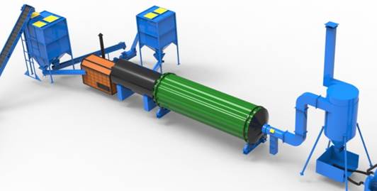 Барабанный сушильный агрегат мод. АВМ 0.65 предназначен для просушки исходного сырья, применяется в промышленных объемах. Сушильный комплекс включает в себя: твердотопливный топочный блок, шнековый транспортер, вентилятор тягодутьевой, транспортер подачи сырья в барабан, сушильный барабан с механическим приводом, золоуловитель, нагнетатель воздуха и осадительный циклон для сбора просушенного сырья.