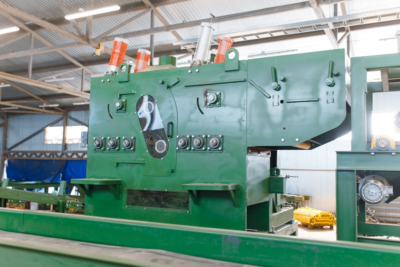 Брусовальный станок – Является основным компонентном лесопильной линии ProSaw. Обеспечивает распиловку кругляка «в развал» или с брусовкой. В зависимости от конкретной модификации агрегат способен обрабатывать от 200 до 350 кубометров леса в смену (8 часов). Треки V-образного типа, в сочетании с верхними пневмоприжимами хорошо центрируют бревна. Высокая производительность достигается благодаря двухвальной схеме распила бревен изнутри. Такое решение также защищает пилы от воздействия пыли, песка, других загрязнений. Особая компоновка верхнего вала позволяет при необходимости устанавливать меньшие пилы для распила тонкого кругляка.