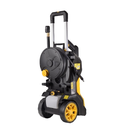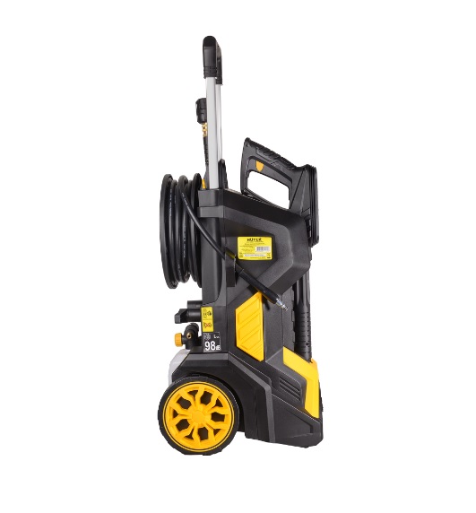 Комплект поставки включает профессиональный пеногенератор и длинный шланга (10 м), что значительно упрощает доступ к удалённым участкам. Для компактного хранения и переноски предусмотрена система наматывания шланга на барабан. Колёса и эргономичная ручка делают транспортировку мойки лёгкой и комфортной.